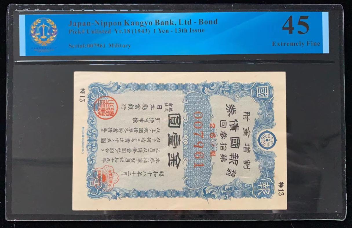 日本 / 日本劝业银行-债券, 1 日元 Yr.18 (1943)- 第十三次发行