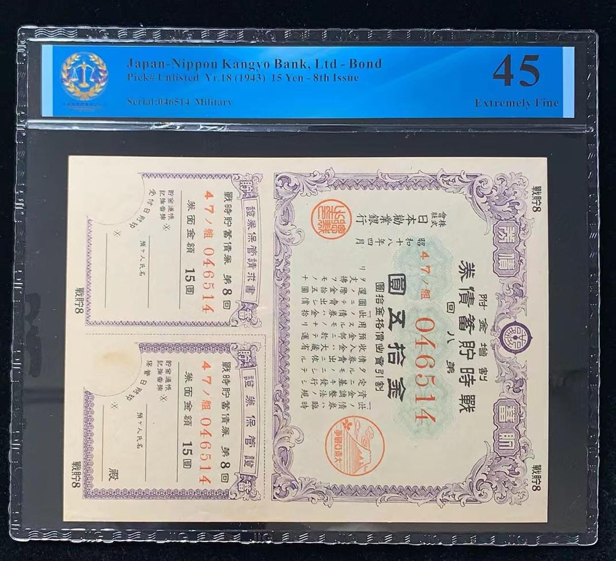 日本 / 日本劝业银行-债券, 15 日元 Yr.18 (1943)- 第八次发行
