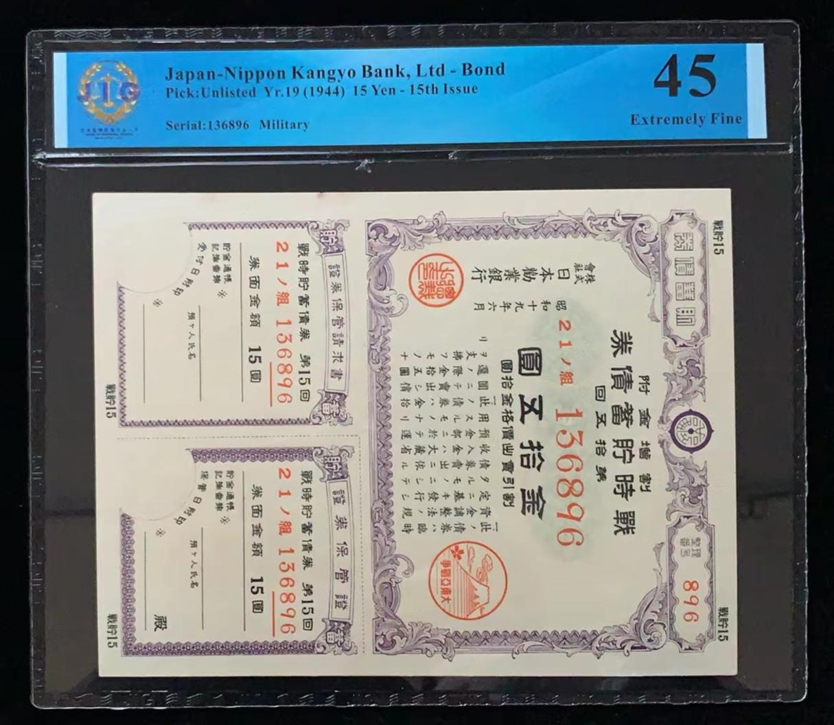 日本 / 日本劝业银行-债券, 15 日元 Yr.19 (1944)- 第十五次发行