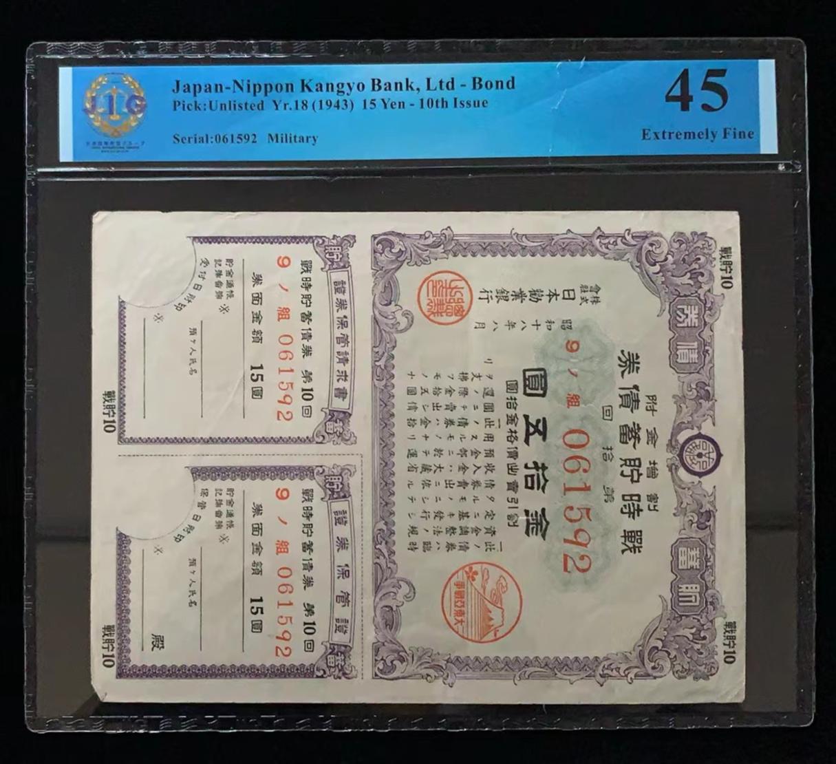 日本 / 日本劝业银行-债券, 15 日元 Yr.18 (1943)- 第十次发行