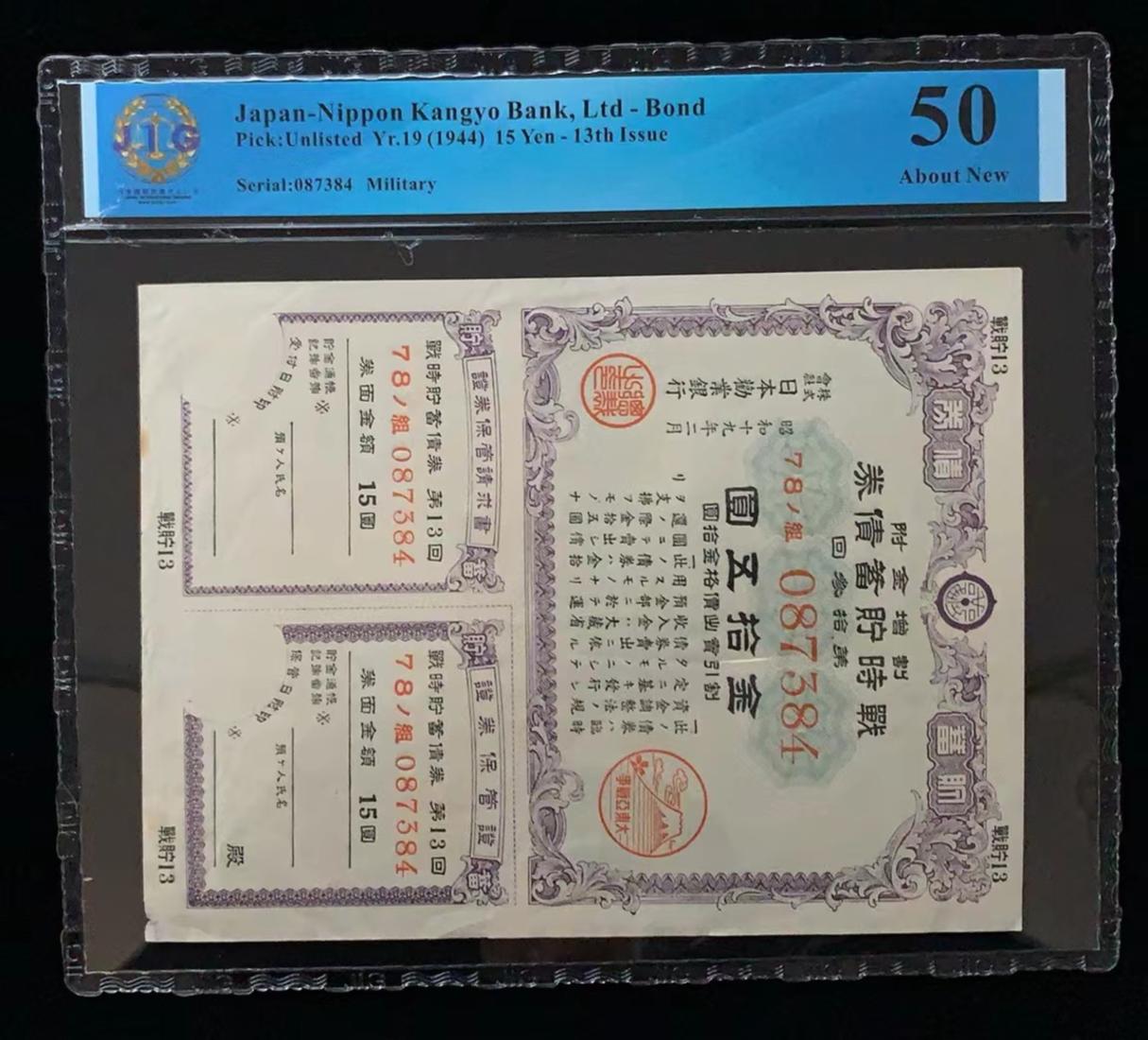 日本 / 日本劝业银行-债券, 15 日元 Yr.19 (1944)- 第十三次发行