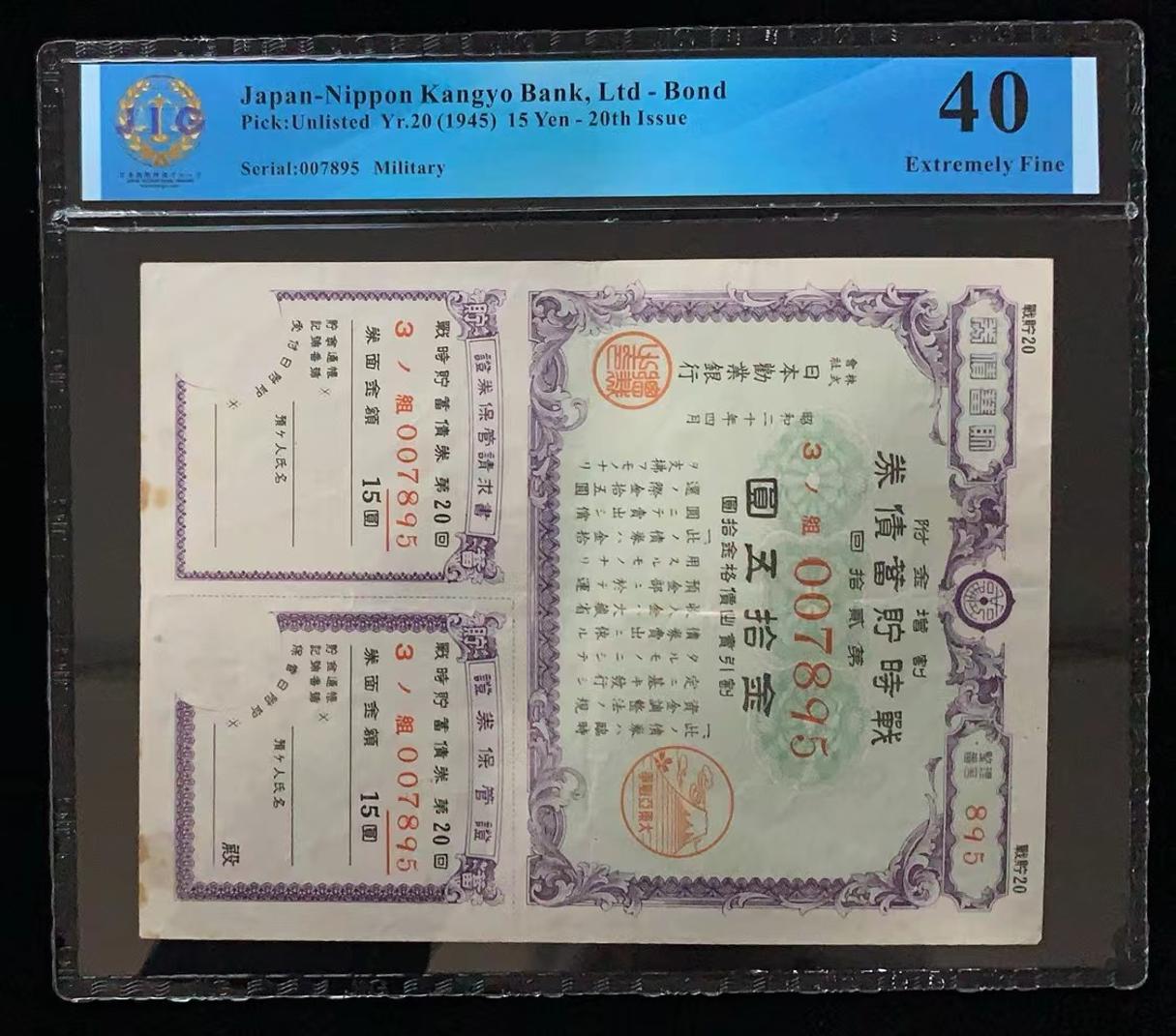 日本 / 日本劝业银行-债券, 15 日元 Yr.20 (1945)- 第二十次发行
