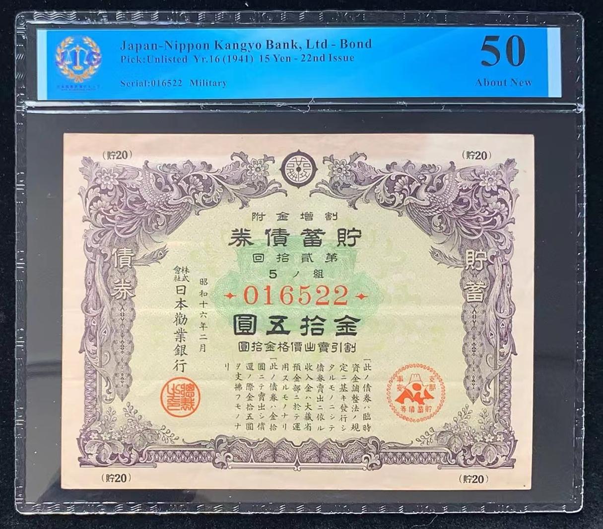 日本 / 日本劝业银行-债券, 15 日元 Yr.16 (1941)- 第二十二次发行