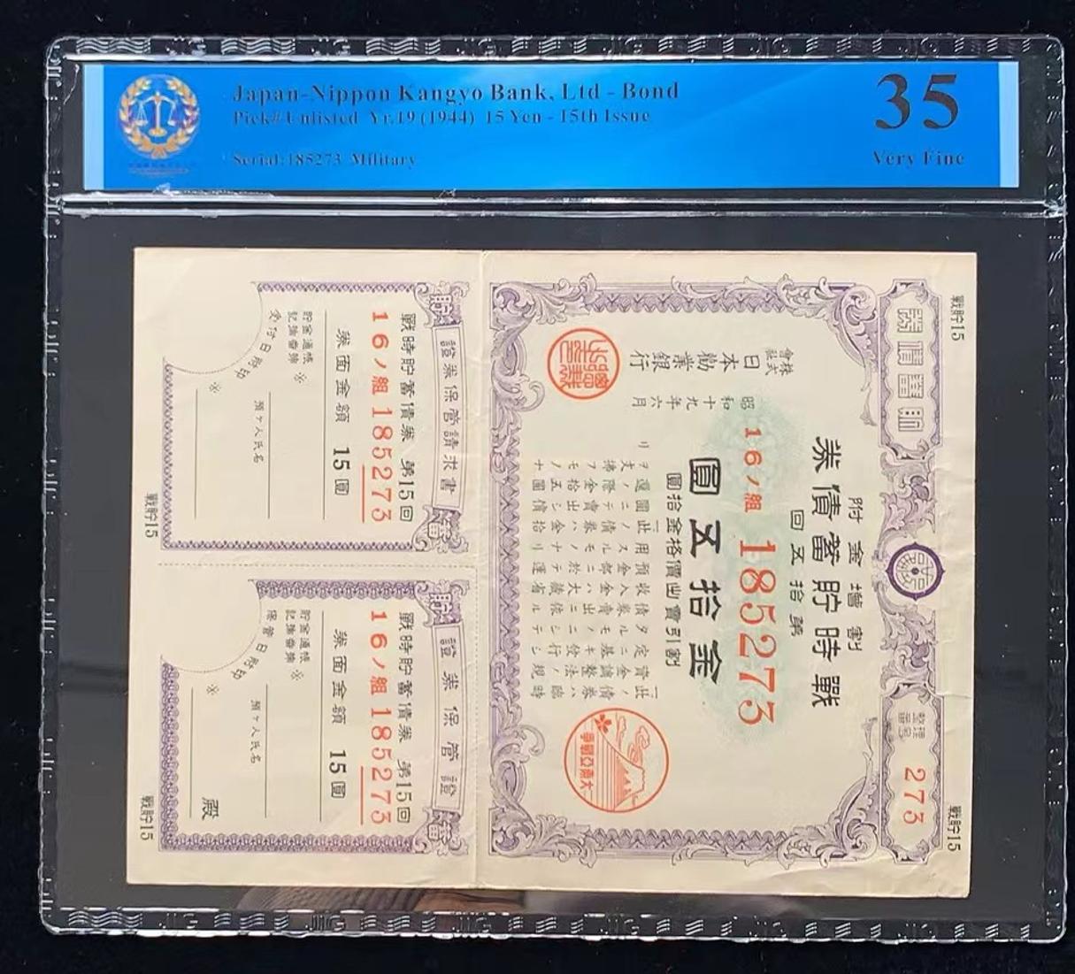 日本 / 日本劝业银行-债券, 15 日元 Yr.19 (1944)- 第十五次发行