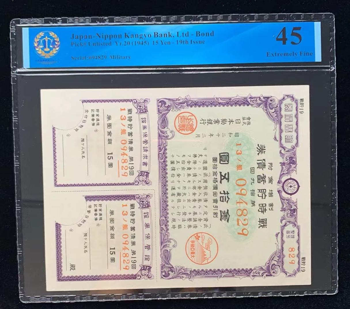 日本 / 日本劝业银行-债券, 15 日元 Yr.20 (1945)- 第十九次发行