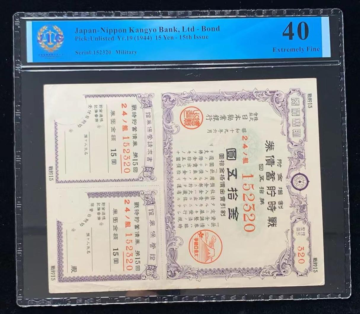 日本 / 日本劝业银行-债券, 15 日元 Yr.19 (1944)- 第十五次发行