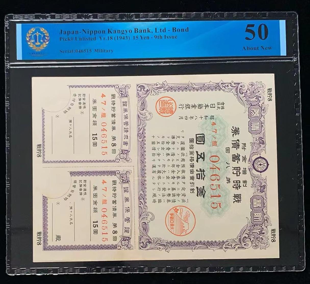 日本 / 日本劝业银行-债券, 15 日元 Yr.18 (1943)- 第九次发行