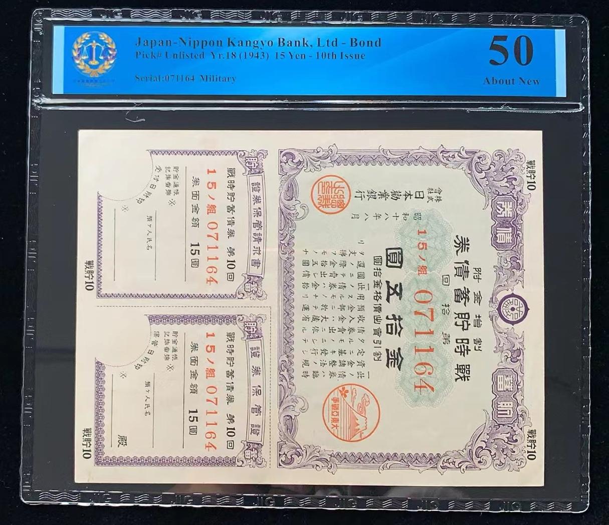 日本 / 日本劝业银行-债券, 15 日元 Yr.18 (1943)- 第十次发行