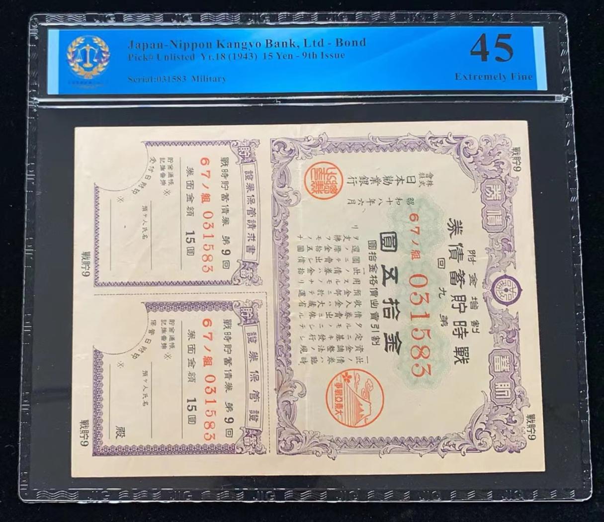 日本 / 日本劝业银行-债券, 15 日元 Yr.18 (1943)- 第九次发行
