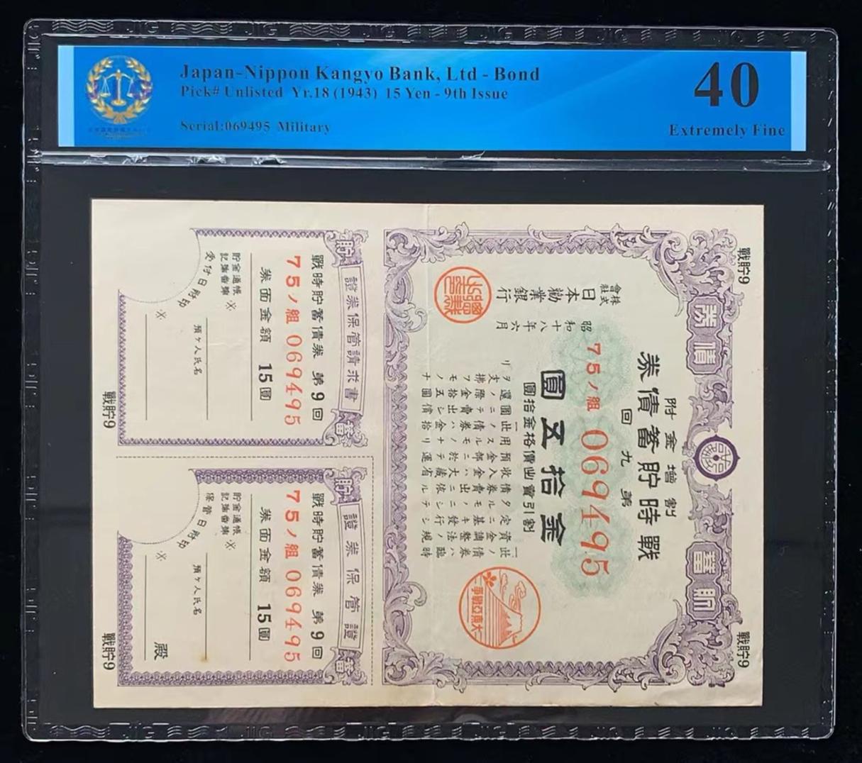 日本 / 日本劝业银行-债券, 15 日元 Yr.18 (1943)- 第九次发行
