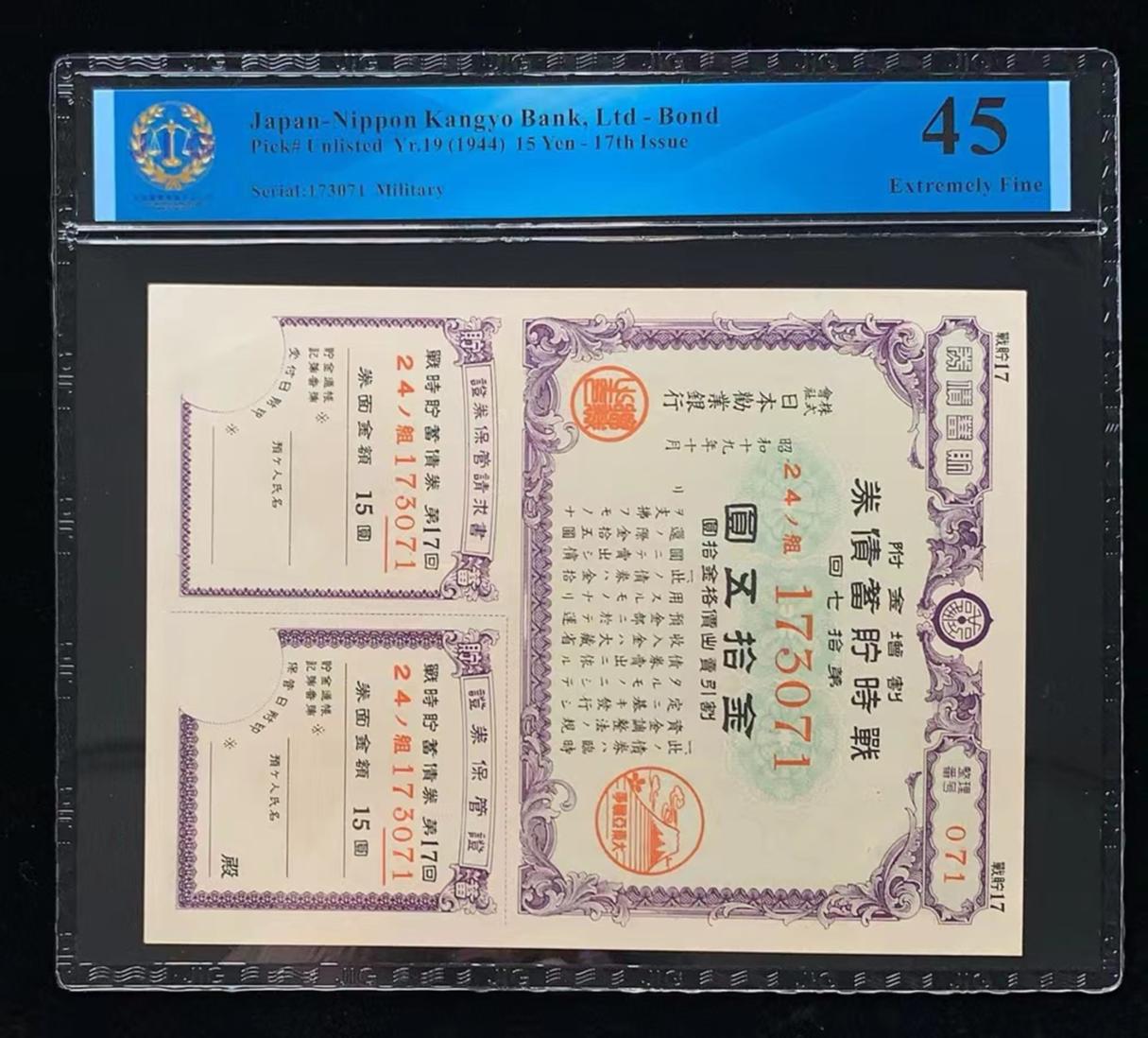 日本 / 日本劝业银行-债券, 15 日元 Yr.19 (1944)- 第十七次发行
