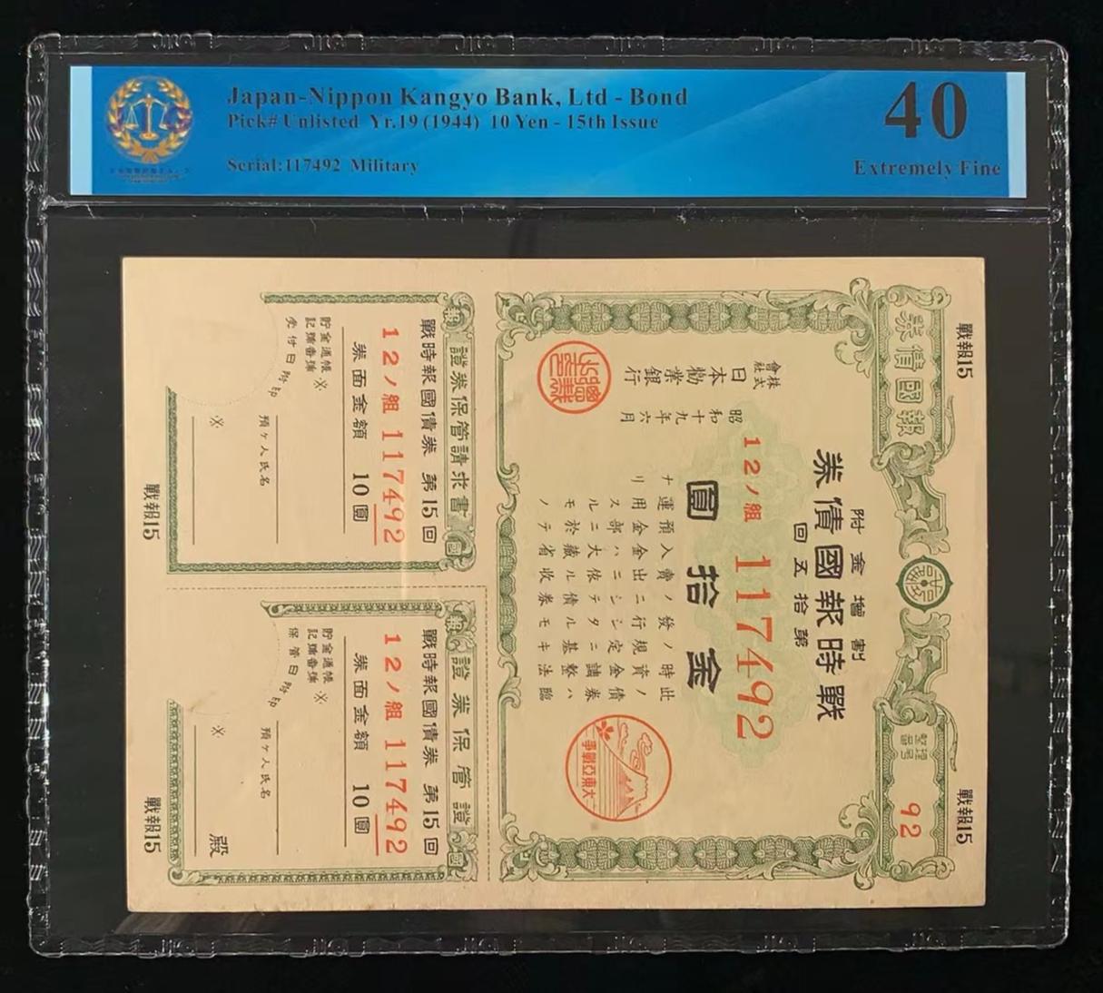 日本 / 日本劝业银行-债券, 10 日元 Yr.19 (1944)- 第十五次发行