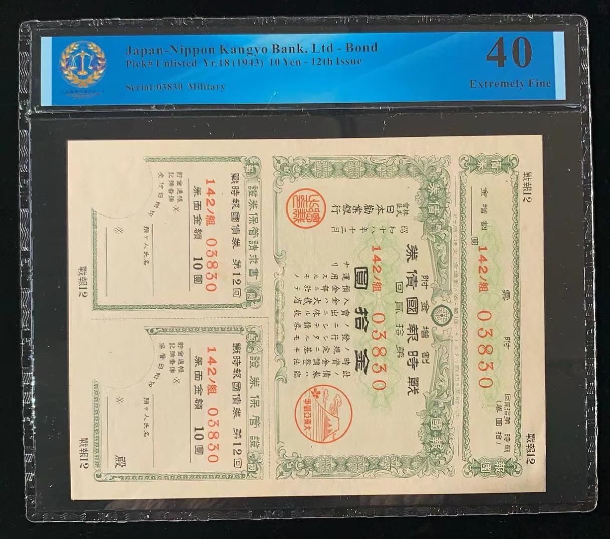 日本 / 日本劝业银行-债券, 10 日元 Yr.18 (1943)- 第十二次发行